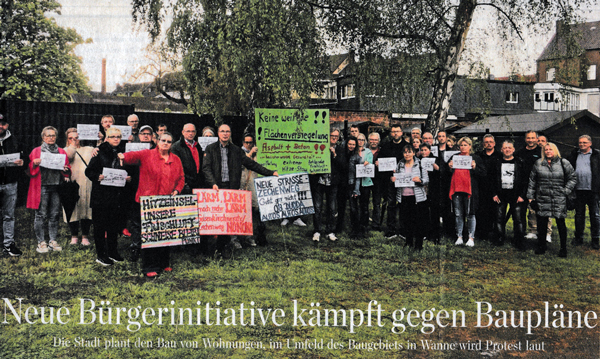 Die von der BI Zechenweg vorgeschlagene Prüfanfrage für eine "maßvolle" Bebauung mit Erhalt der Privatgärten und Vorsehen eines Quartiersparks wurde leider bisher von der Bezirksvertretung Wanne nicht an die Verwaltung weitergeleitet, obwohl diese Prüfanfrage als Entwurf seit Anfang des Jahres der Bezirksvertretung Wanne vorliegt.